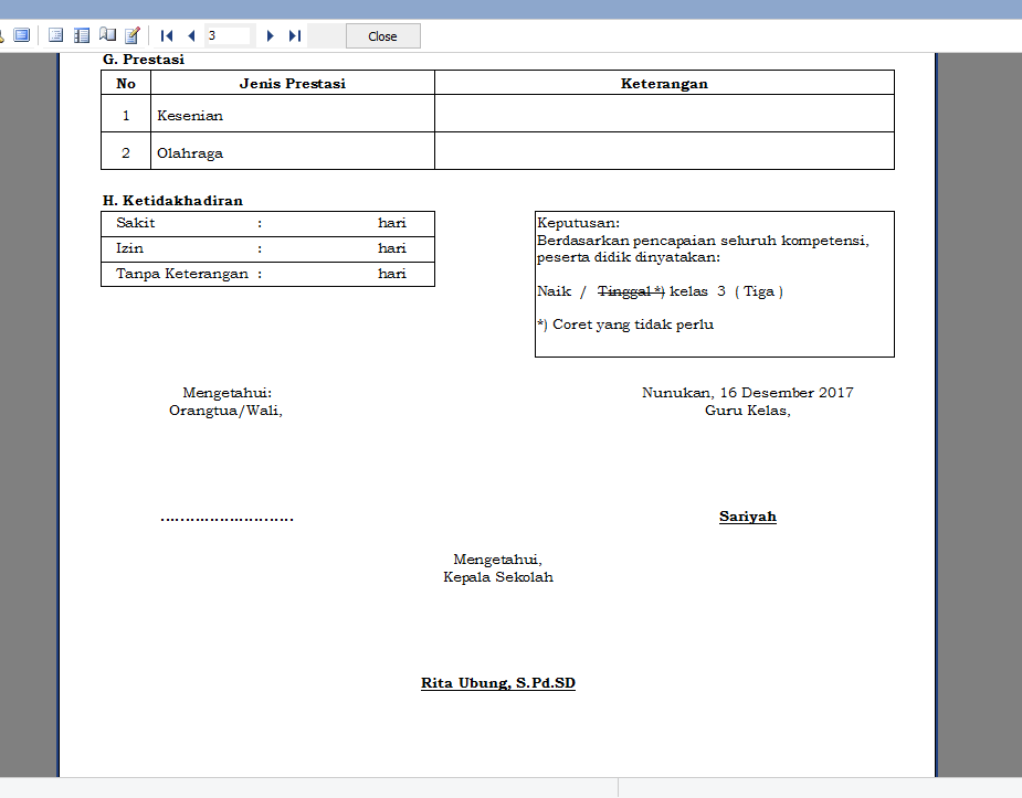 3. hasil cetak rapor dengan keterangan kenaikan kelas.